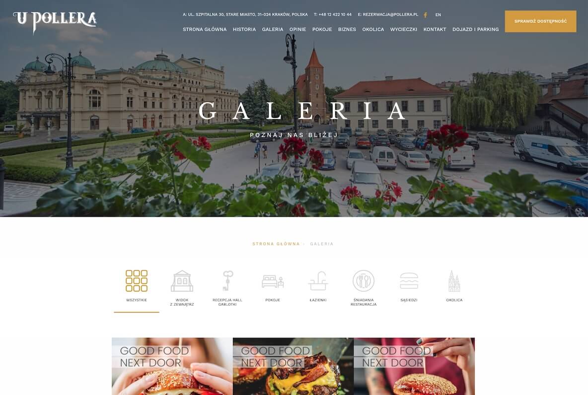 Hotel Pollera działa nieprzerwanie od 1834 roku przy ulicy Szpitalnej 30 w Krakowie - minutę pieszo od Rynku Głównego. Budynek wpisany jest do rejestru zabytków. Wnętrza w stylu secesyjnym, witraże Stanisława Wyspiańskiego, ocena 9.6 na Booking.com. To nie jest hotel, który potrzebuje szablonowej strony internetowej.